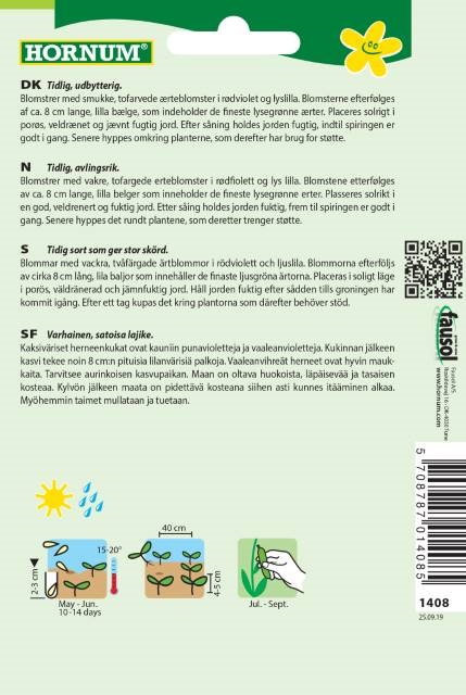 Blomstrer med smukke, tofarvede ærteblomster i rødviolet og lyslilla. Blomsterne efterfølges af ca. 8 cm lange, lilla bælge, som indeholder de fineste lysegrønne ærter. Placeres solrigt i porøs, veldrænet og jævnt fugtig jord. Efter såning holdes jorden fugtig, indtil spiringen er godt i gang. Senere hyppes omkring planterne, som derefter har brug for støtte.