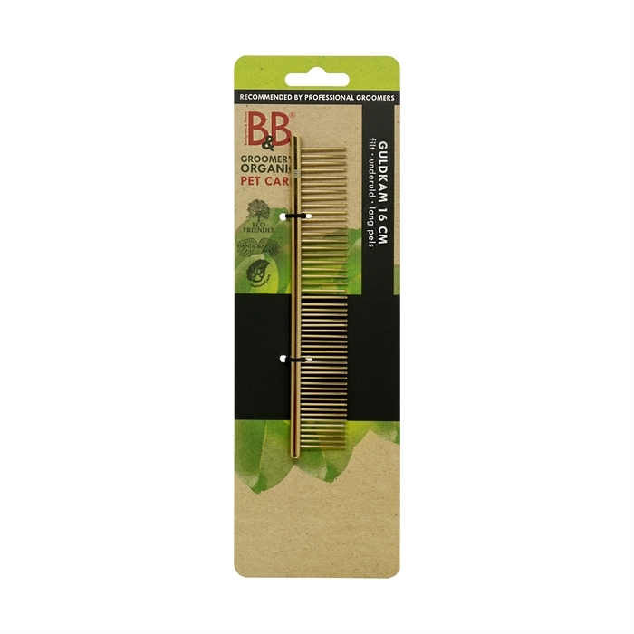 B&B Guldkam er en solid og holdbar kam, udviklet til grundig og skånsom pelspleje. De afrundede tænder gør kammen behagelig at anvende og sikrer, at pelsen redes uden unødig belastning af hud og hår.