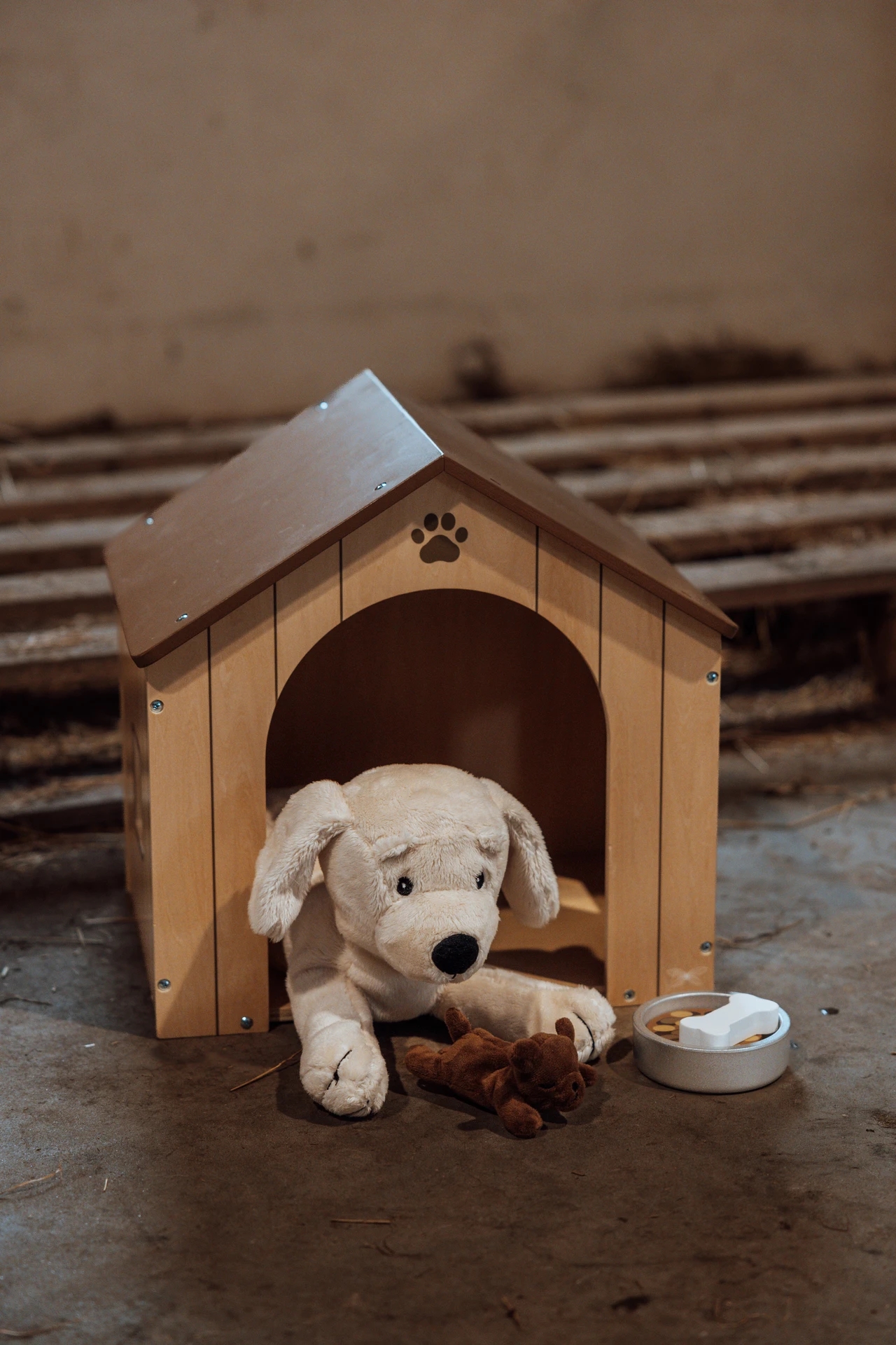 Skab det perfekte hjem for plyshunden og hendes bedårende hvalpe med dette hyggelige og charmerende hundehus. Dette dejlige hundehus kommer med alt, hvad der er nødvendigt for at passe på plyshundene - inklusiv foder og hundeskål.