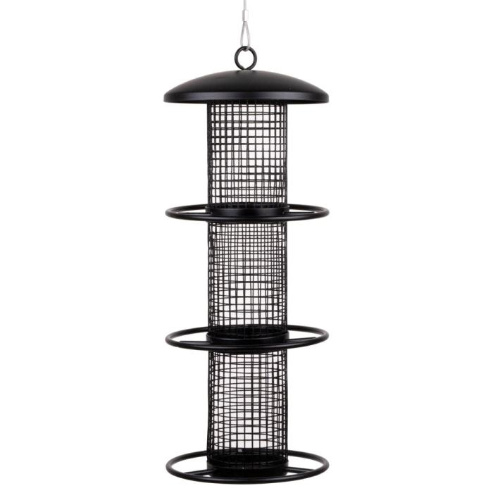 CARE-Bird Foderautomat, nødder, sort metal, large. Til nødder. Sort metal over det hele. De tre platforme giver plads til flere fugle samtidig. Med ophæng. 14 x 36 cm.