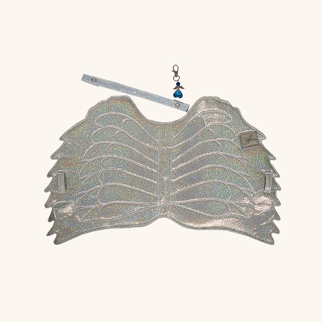 Sadelunderlaget er designet som sarte engle- eller enhjørningevinger og har et helt særligt, eventyrligt udtryk. Det matcher perfekt med pandebåndet i glitrende stof, som fuldender looket. Den lille charm kan sættes fast på sadelunderlaget, pandebåndet eller andre steder – og tilføjer et strejf af elegance og magi.
