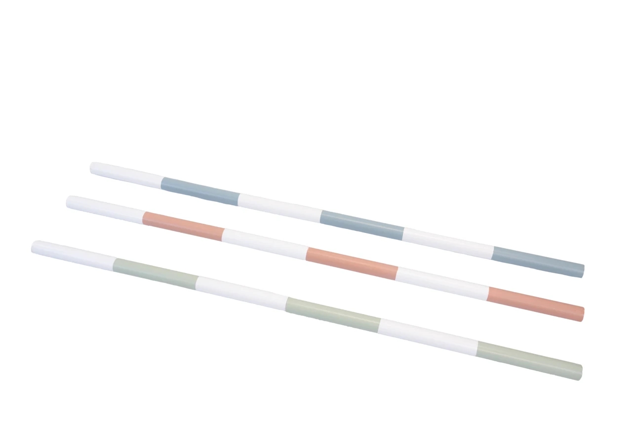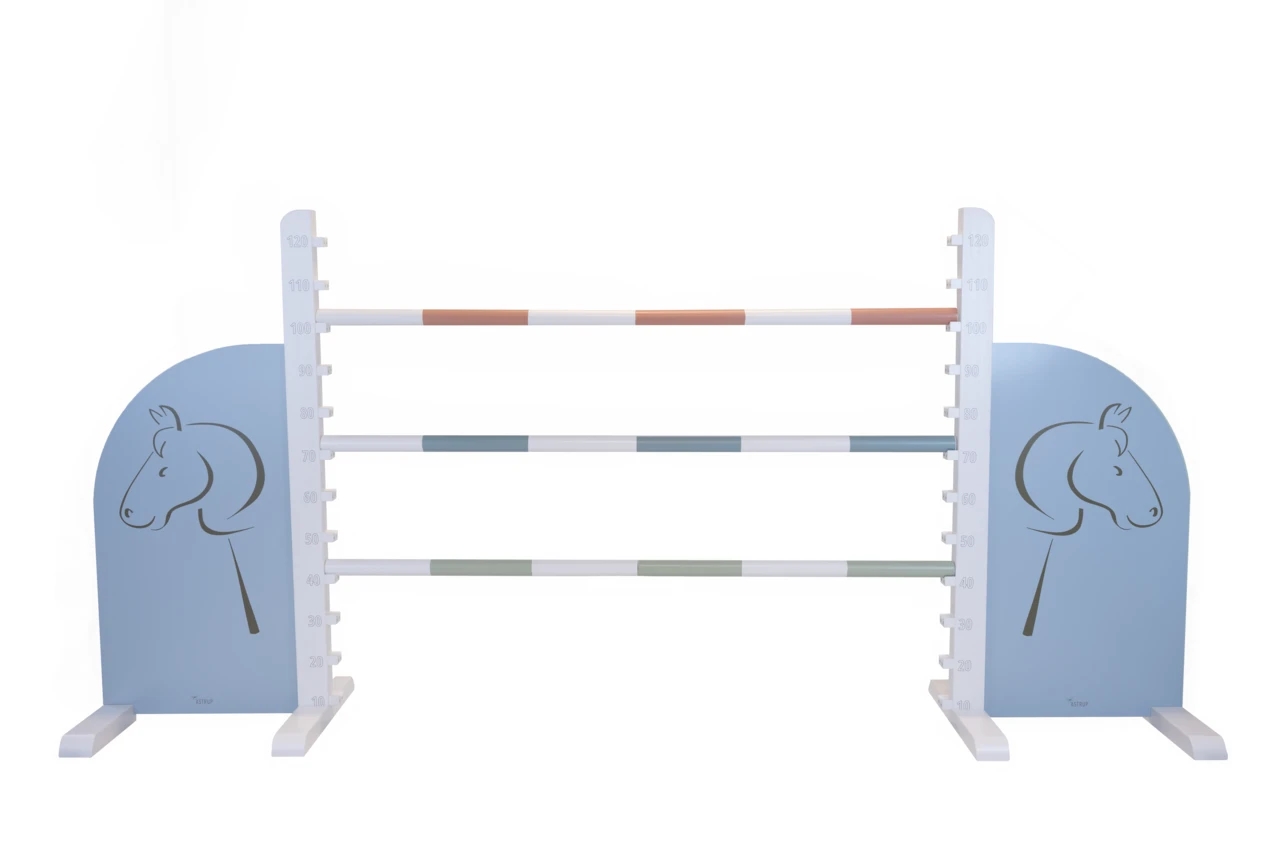 Det rosa- og hvidstribede design skaber en let, legende stemning, samtidig med at det bevarer et stilrent og sammenhængende udtryk. Uanset om de bruges til træning eller konkurrencer, giver disse springbomme en flot og dynamisk udfordring til unge kæphesteryttere og deres kæpheste.
