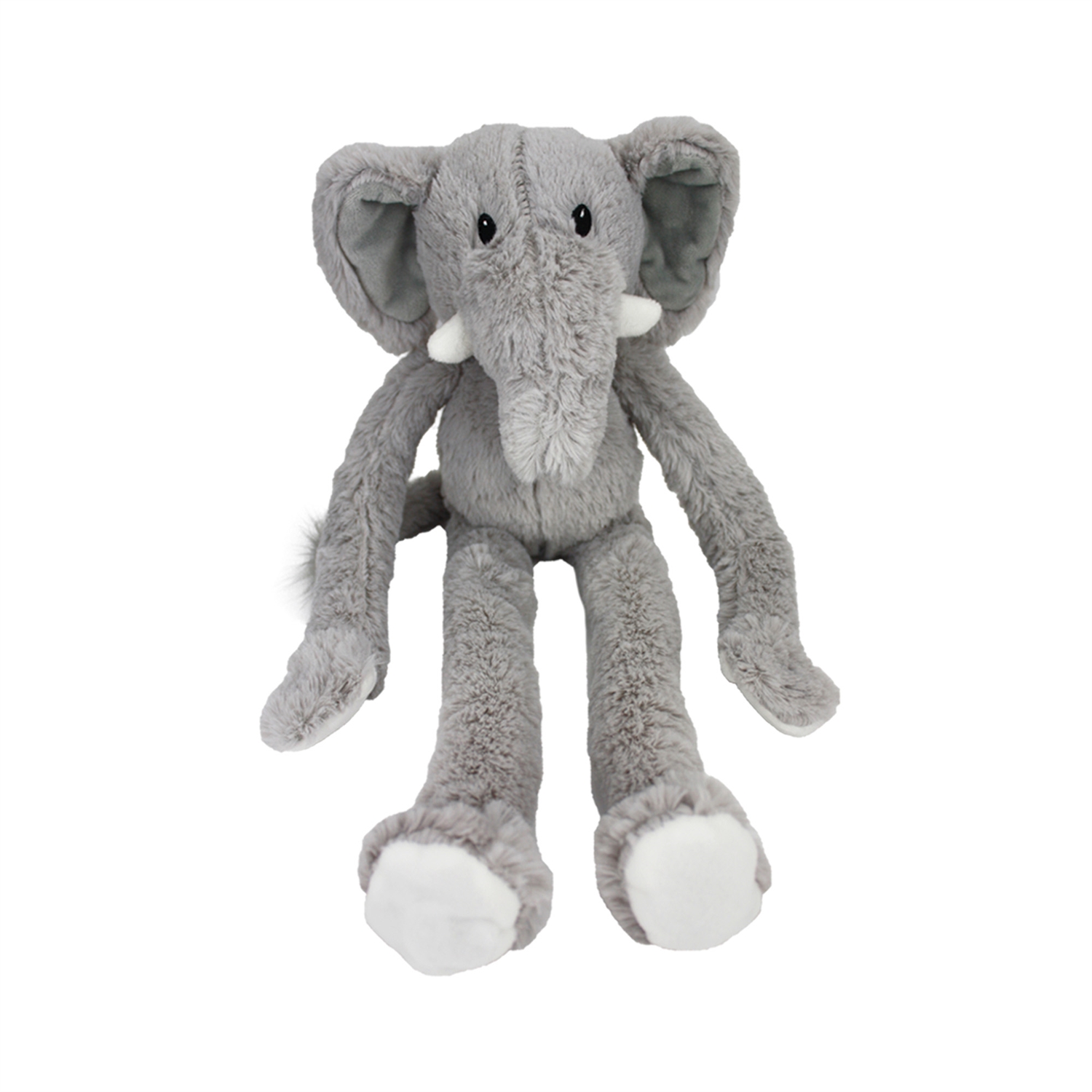 Ekstra lang plyselefant med lange arme og ben samt flere squeakers – ideel til leg og hygge.