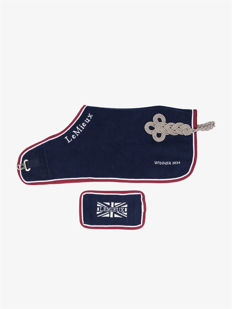 LeMieux Mini Toy Pony Vinder Dækken i marineblå med kontrastkant, logo-broderi og klassiske hofteornamenter. Miniature vinderdækken i ægte LeMieux-stil.