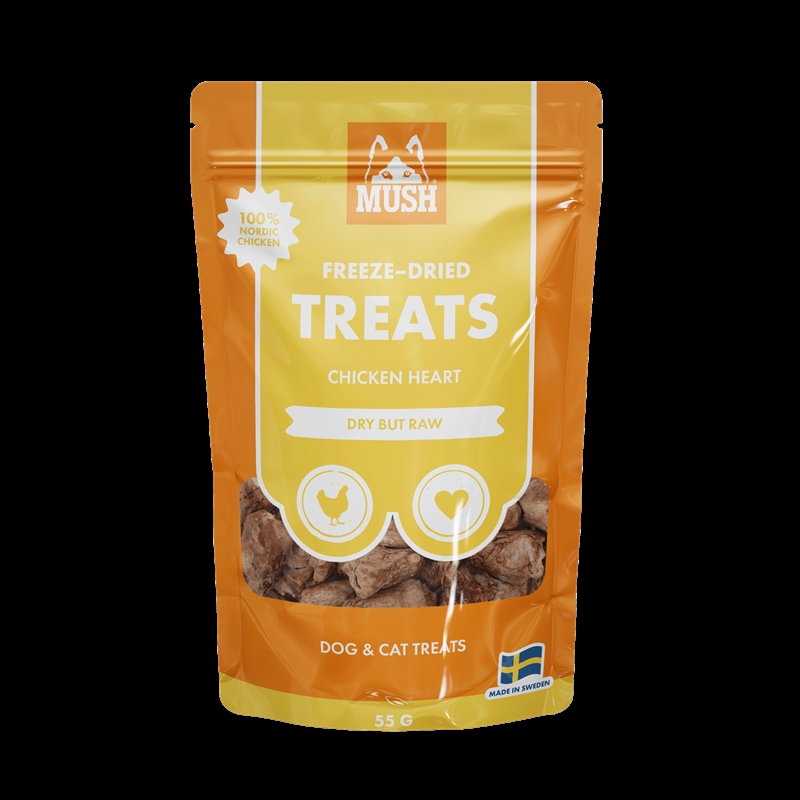 MUSH Frysetørrede Godbidder Kyllingehjerte er en velsmagende og naturlig hundesnack fremstillet af 100 % kyllingehjerte af nordisk kvalitet. Kyllingehjerte er rigt på protein og indeholder naturlige næringsstoffer, der bidrager til hundens velbefindende.