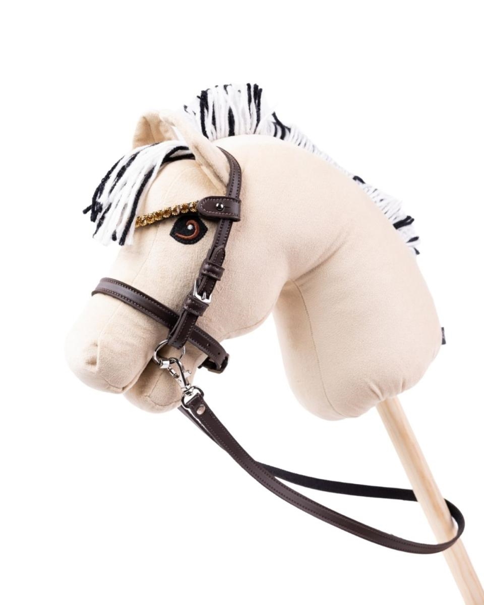 Stilfulde My Hobby Horse Trense - Brun med guldsten . Denne holdbare trense har justerbare spænder og et udskifteligt pandebånd med blændende sølvsten. Inkluderer autentisk bid og aftagelige tøjler. Perfekt til enhver kæphest-entusiast!