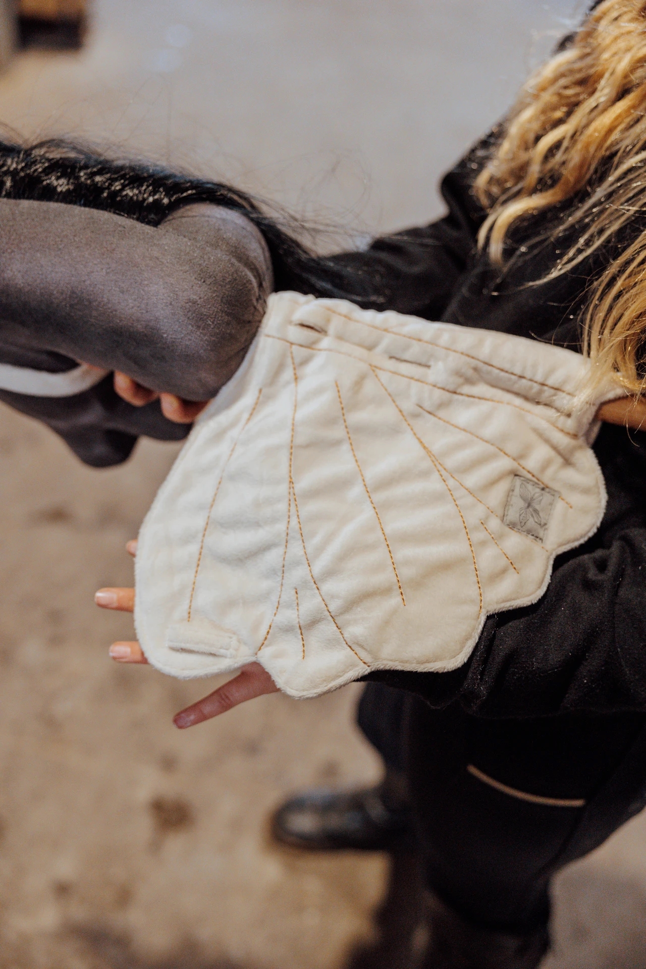 Gør kæphesten klar til arenaen med dette smukke cream-farvede sæt bestående af sadelunderlag og matchende hut. Det bløde, luksuriøse stof føles eksklusivt, mens de fine kobberfarvede stikninger tilfører varme og raffinerede detaljer. Resultatet er et unikt udtryk, der fremhæver kæphestens elegance og skaber et look inspireret af sommerfuglevingernes delikate skønhed.