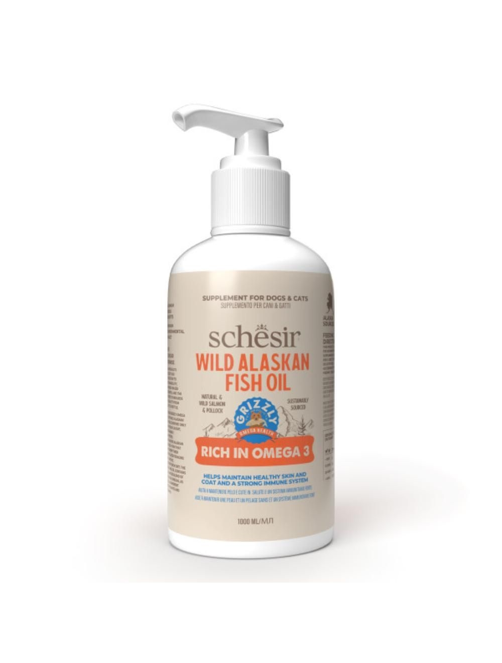 Schesir Grizzly Wild Lakseolie er et naturligt og miljøvenligt omega 3-kosttilskud til både hunde og katte.