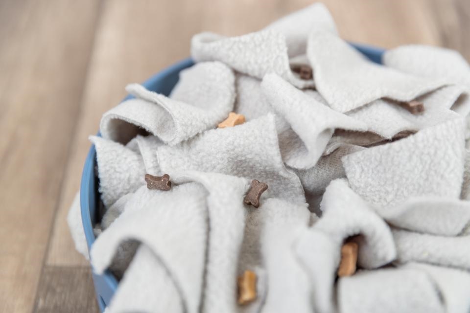 For at øge sværhedsgraden kan snacks rulles enkeltvis ind i kvasterne, hvilket giver ekstra mental aktivering og forlænger spisetiden. Hide'n'Sniff Bowl kan også bruges til daglig fodring med tørfoder og er derfor både et aktiveringslegetøj og en praktisk foderskål i ét.